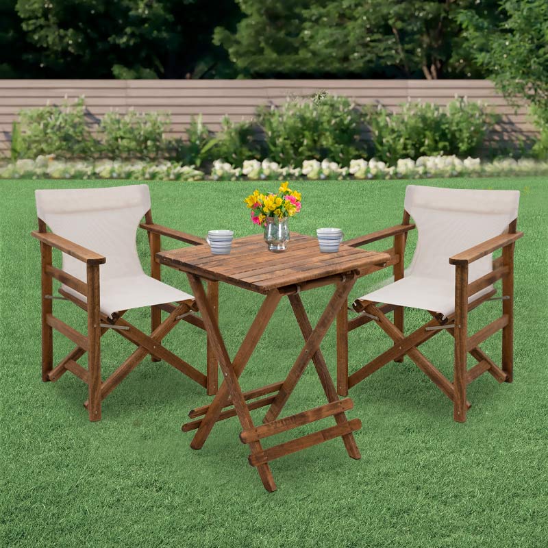Σετ τραπεζαρία κήπου Queen Megapap ξύλινη τραπέζι 60×60εκ. – πολυθρόνα σκηνοθέτη καρυδί – εκρού πανί S_GP045-0002,1+GP045-0001,1×2