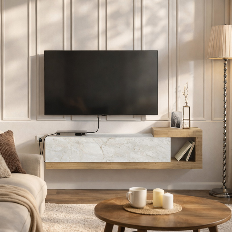 Έπιπλο τηλεόρασης επιτοίχιο Volare Megapap χρώμα λευκό εφέ μαρμάρου – sapphire oak 150×29,6×38,6εκ.